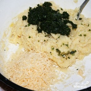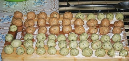 Посыпаем рабочую поверхность мукой. Из получившегося теста формируем маленькие шарики - ньокки. Накрываем ньокки пищевой пленкой и ставим на 30 минут в холодильник.