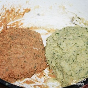 Хорошенько перемешиваем, добавляем муку и замешиваем тесто. Тесто разделяем на две части, в одну из которых вмешиваем 1 ст.л. томатной пасты.