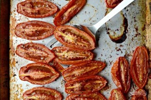 1. Помидоры разделите на половинки. Потом выложите на противень мякотью вверх. Посыпьте их перцем и солью, а также полейте маслом.