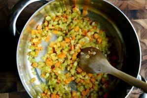 3. В это время займитесь овощами. Нарежьте мелкими кубиками сельдерей, лук и морковь. Обжарьте овощи в масле в течение 25 минут, помешивая.