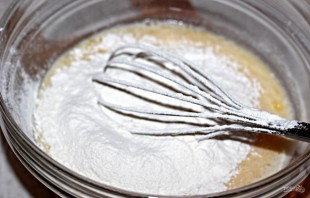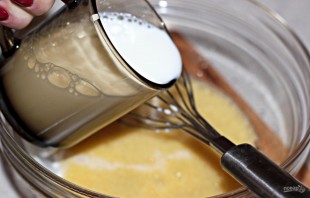 1. В миску вбиваю яйца, насыпаю сахар и щепотку соли, взбиваю венчиком или миксером. Молоко подогреваю до комнатной температуры и вливаю в миску, перемешиваю.