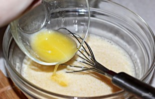 2. Сливочное масло растапливаю и добавляю в миску к молоку и яйцам, перемешиваю до однородной консистенции.