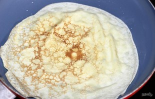 4. Сковороду ставлю на огонь, наливаю немного подсолнечного масла и разогреваю, на раскаленную поверхность выливаю чуть теста, распределяю ровным слоем и обжариваю с двух сторон.