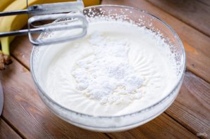 Добавьте 60 грамм сахарной пудры и вмешайте ее миксером во взбитые сливки.