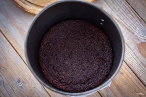 На дно формы застеленной пергаментом для выпечки выложите первый бисквитный корж, пропитайте его приготовленной шоколадной пропиткой с помощью силиконовой кисточки.