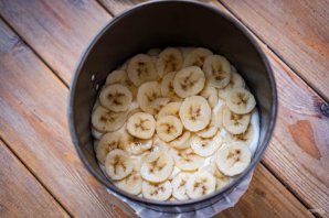 На бисквит выложите слоем примерно 200 грамм крема и поверх разложите половину банановых кружочков.
