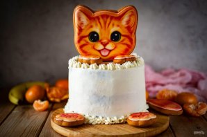 У меня младший ребенок очень любит котиков, поэтому я украсила торт пряниками в виде котика, вы же украшайте торт по своему вкусу.