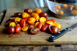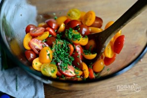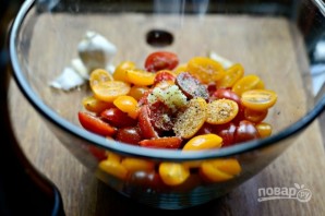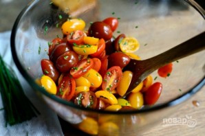 3. Потом перемешайте помидоры с нарезанным луком, маслом и уксусом.