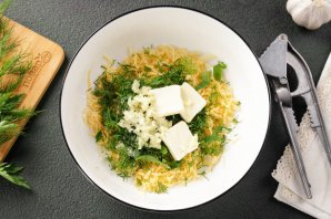 Сыр натрите на мелкой тёрке и переложите в глубокую миску.