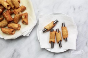 6. Выкладывайте трубочки в масло и жарьте на румяности. Достаньте аккуратно шумовкой и выложите на бумажное полотенце. Остудите немного, чтобы снять насадку.