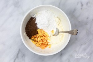 7. Для приготовления начинки соедините в глубокой мисочке тертый шоколад, рикотту, молоко, сахарную пудру. По желанию добавьте немного цукатов.