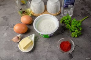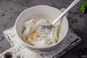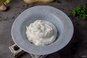 К йогурту добавьте соль, черный молотый перец и измельченный чеснок. Если йогурт с большим содержанием сыворотки, то откиньте его на сито.