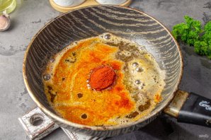 Добавьте молотую паприку, перемешайте и прогрейте 1 минуту. Снимите сковороду с плиты.