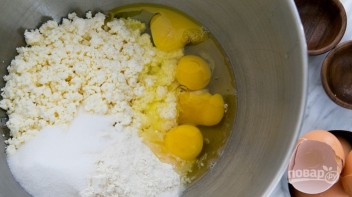 1. В миску или в чашу миксера выложите творог, вбейте к нему куриные яйца, ¾ стакана муки, сахар и соль.
