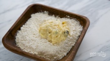 6. Оставшуюся муку переложите в миску, возьмите небольшое количества теста (с помощью ложки) и выложите в муку.
