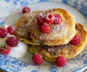 9. Выложите творожники на тарелку, украсьте сахарной пудрой, малиной и подавайте со сметаной.