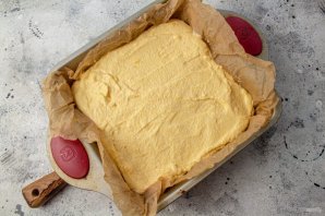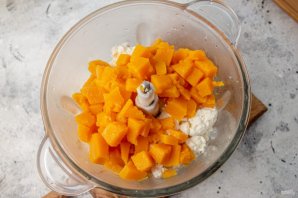 Тыквенную массу выложите в форму для выпечки, выстеленную пергаментом. Выпекайте в заранее разогретой духовке до 180 градусов 45-50 минут. Достаньте готовую запеканку и дайте ей остыть.