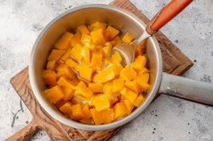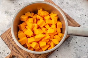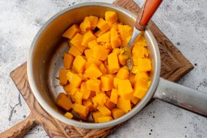 Тыкву очистите и нарежьте небольшим кубиком, выложите ее в кастрюлю.