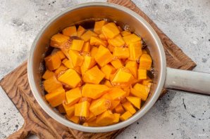 Чтобы проверить готовность тыквы, проткните кусочек ножом, если он свободно входит, то тыква готова. Снимите с плиты.