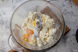 В чашу блендера поместите творог, вбейте яйца, добавьте сахарозаменитель и влейте молоко.