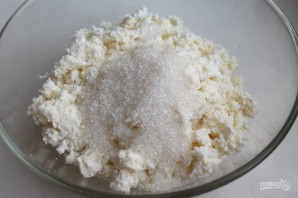 Соедените в миске творог и сахар.