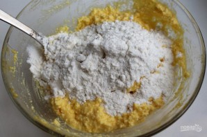 Постепенно насыпайте муку и разрыхлитель. Тесто должно получиться мягким, но не должно липнуть к рукам.