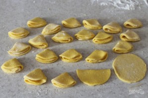 Каждый кружок теста согните пополам, а потом еще раз пополам. Получаются сложенные четвертушки. Выпекайте творожное печенье на противне с пергаментом при температуре 180 градусов (12-15 минут).