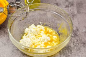 Взбейте яйцо, добавьте творог и тщательно его разотрите с яйцом.