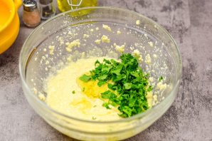 Можно воспользоваться погружным блендером. Теперь добавьте ложку масла и нарезанную зелень. Можете взять петрушку, укроп или кинзу — по вашему вкусу.