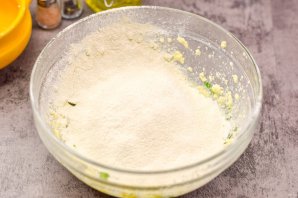 Перемешайте все и просейте пшеничную муку с разрыхлителем.