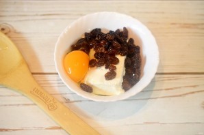 2. К творогу добавьте яйцо и промытый изюм.