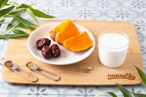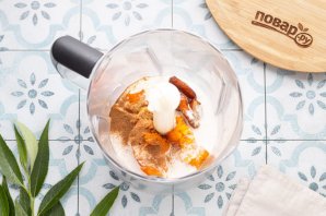 Переложите тыкву и финики в блендер. Добавьте все пряности и влейте кокосовое молоко.