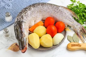 Подготовьте указанные продукты. Щуку очистите от чешуи и внутренностей, удалите жабры из головы и тщательно промойте. Разрежьте тушку на части — для ухи основными считаются голова, хвост, плавники с брюшка (они жирные). Очистите картофель, лук и морковь от кожуры, промойте.