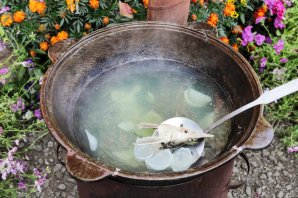 Уха из стерляди на костре готова. Накройте казан крышкой, снимите с огня и подождите 7-10 минут, чтобы блюдо настоялось.