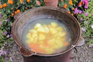 В кипящий бульон добавьте картофель и морковь. Кипение должно быть минимальным. Количество картофеля регулируйте на свой вкус.