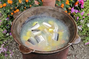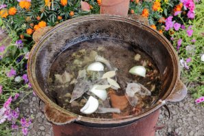 Для такого блюда лучше всего использовать вместительный казан. Налейте воду и поставьте на огонь. Добавьте в воду головы, хвосты и срезанные плавники. Так же добавьте нарезанную на части луковицу, можно прямо в шелухе и лавровый лист. Можно положить несколько веточек укропа и корень петрушки, если есть. Ждите пока закипит.