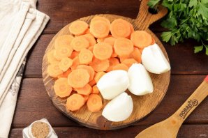 Морковь очистите и нарежьте кружочками или брусками, лук разрежьте на 4 части.