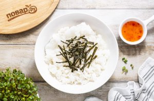 Для подачи выложите отварной рис в тарелку. Посыпьте тонко нарезанным листом нори.