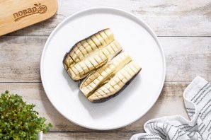 Остудите баклажан. Разрежьте почти пополам, но не доходя до конца. Затем на каждой половинке сделайте еще один разрез вдоль и несколько поперек.