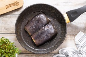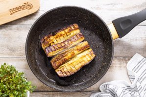 Разогрейте сковороду с растительным маслом. Выложите баклажан разрезом вниз.