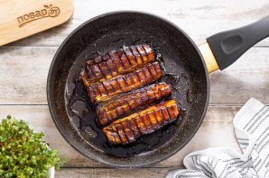 Влейте несколько ложек соуса, жарьте ещё 3–5 минут, поливая срез соусом.