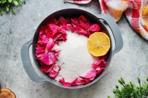 Подготовьте все необходимые ингредиенты для приготовления варенья "Роза в сахаре". Бутоны лучше всего собрать утром, в сухую погоду, так как лишняя влага уменьшит срок хранения и испортит вкус. Банки вымойте с содой и стерилизуйте удобным способом. Крышки прокипятите в течение 5 минут на среднем огне.