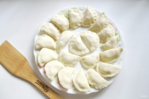 Слепите вареники и выложите на тарелку, присыпанную мукой.