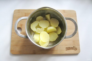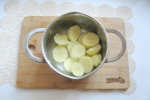 Картофель очистите, выложите в кастрюлю и залейте водой. Посолите по вкусу. Поставьте на плиту.