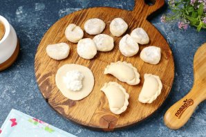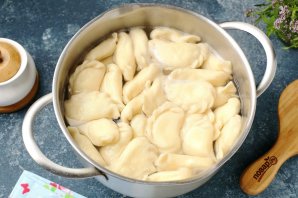 Добавьте в воду немного соли, доведите до кипения и закиньте вареники. Аккуратно перемешайте, чтобы они не прилипли и варите после всплытия около 3 минут.