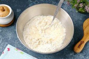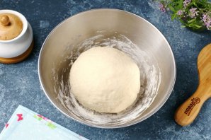 Перемешивайте тесто сначала ложкой, а затем, когда трудно станет мешать, продолжите замес руками. Муки может уйти чуть меньше или больше, чем указано в рецепте. Готовое тесто не должно липнуть к рукам. Соберите его в шар, накройте и дайте полежать 20 минут.