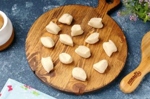 Каждый кусочек обваляйте с двух сторон в муке и раскатайте в форме круга. По центру выложите начинку и соедините края любым удобным способом.