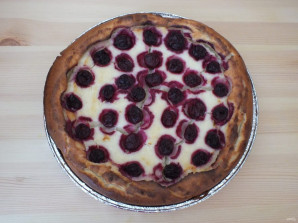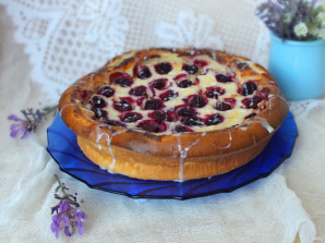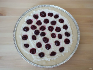 По начинке разложите вишню, слегка вдавливая ее. Разогрейте духовку до 180 градусов. Поставьте выпекаться ватрушку на 45-60 минут. Ориентируйтесь на свою духовку. Если верх сильно зарумянился, а ватрушка еще влажная, прикройте верх фольгой или пергаментом и допеките.