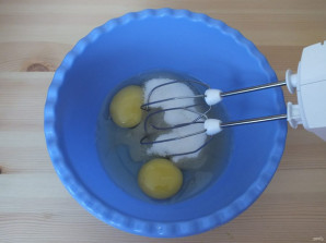 В чашу положите сахар, яйца и взбейте в пену.
