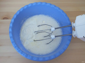 Добавьте растопленное сливочное масло и сметану. Снова взбейте.